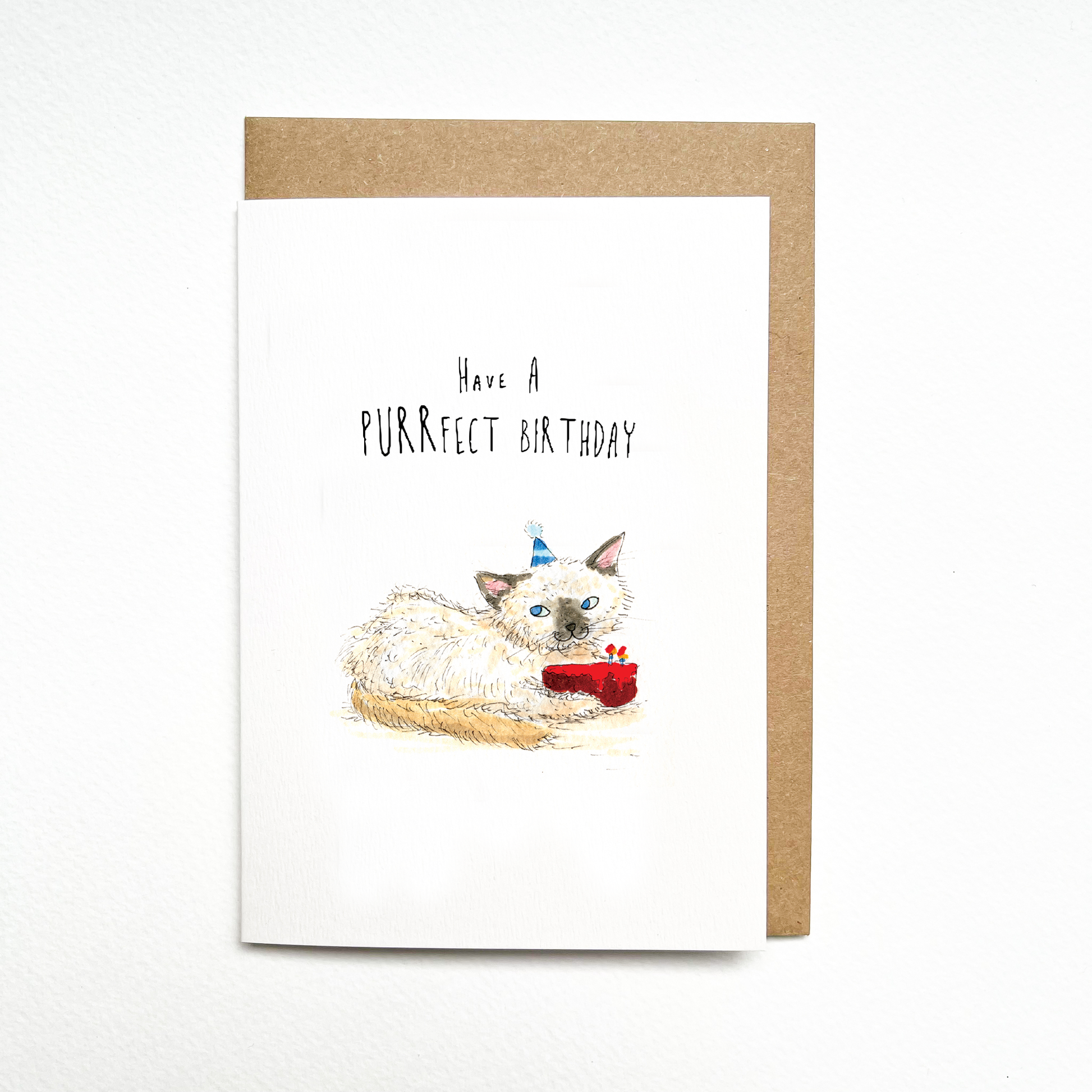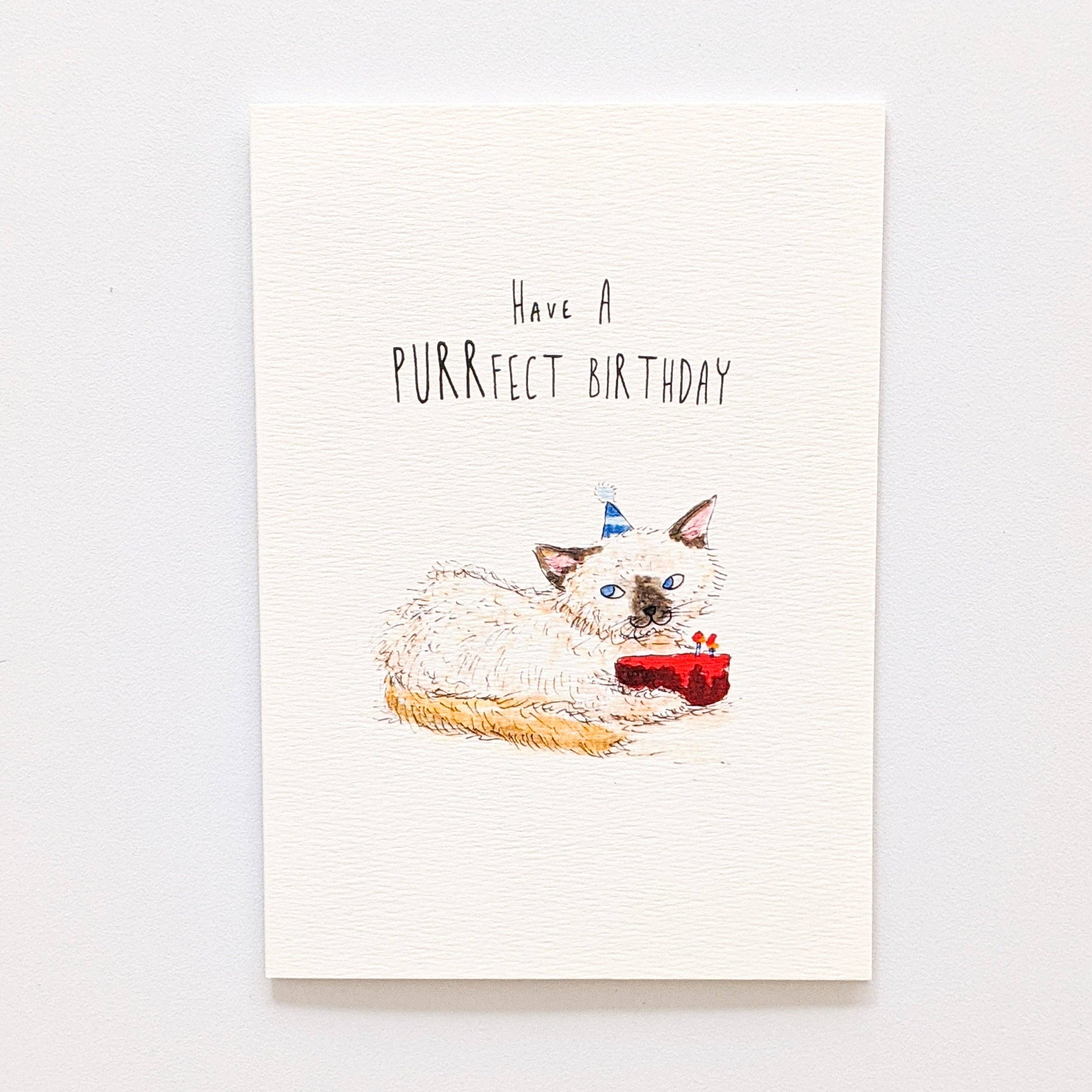 Have a Purrfect Birthday! Show someone special how much you care about them with this super adorable and cuddly, cat lover's, funky feline pun birthday card! Give your cat-loving friends the recognition they deserve for being great! This funny card is perfect for your favorite cat lover on their birthday. The design features a cute birthday cat wearing a birthday hat with-hold a cake. This cat birthday card is sure to bring a smile to anyone's face, but especially to any cat lover.