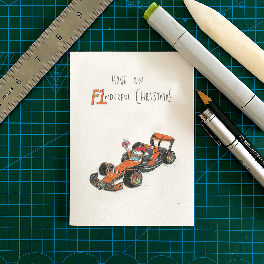Rev up the holiday spirit with our âF1âderful Christmasâ card, perfect for race fans and turboâcharged loved ones. Featuring a festive red F1 car driven by Santa himself (present in hand), this card is made for anyone who likes their Christmas as fast and furious as their Sundays. Inspired by Oscar Piastri for all those Piastri Christmas gift fans.