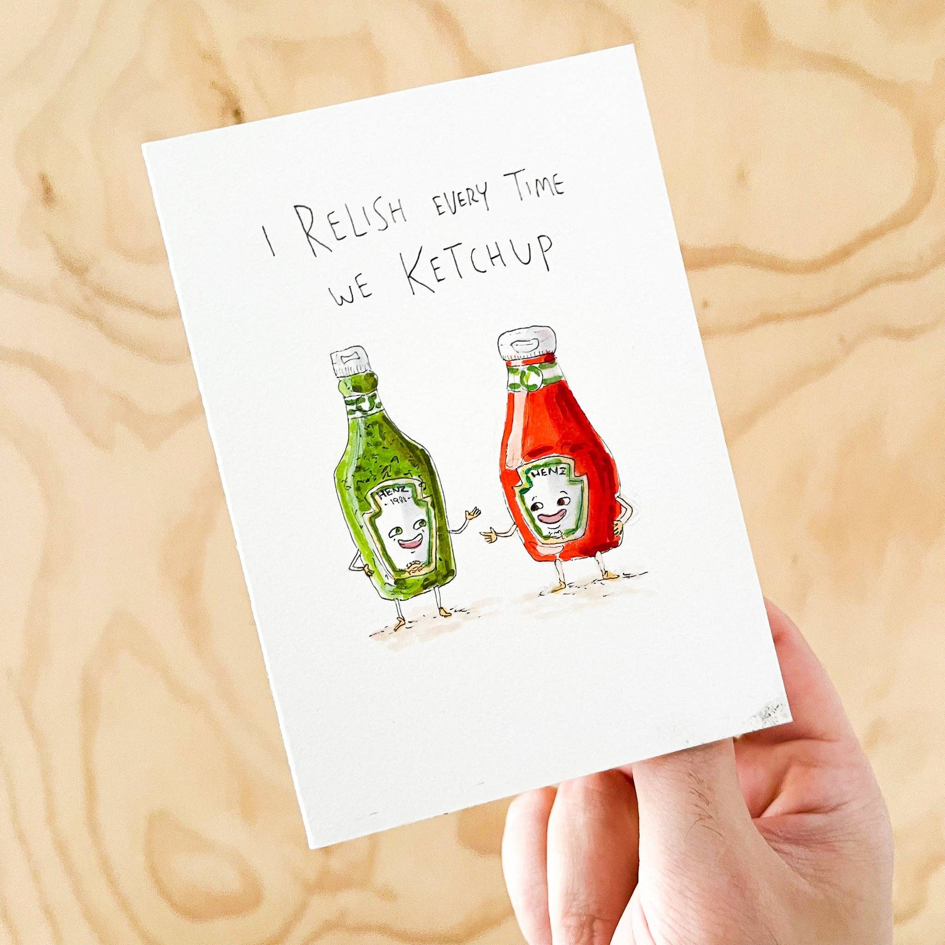 Let your pal know that you want to "ketchup"! Perfect for reconnecting and letting them know that you're thinking of them. The design of this card is made for couples to love. Somewhat ridiculous and interesting. Couples may call each other by many names, but ketchup and taste are fun. You can give this card as a gift on the occasion of a wedding anniversary. And explain to couples the ketchup and flavors.
