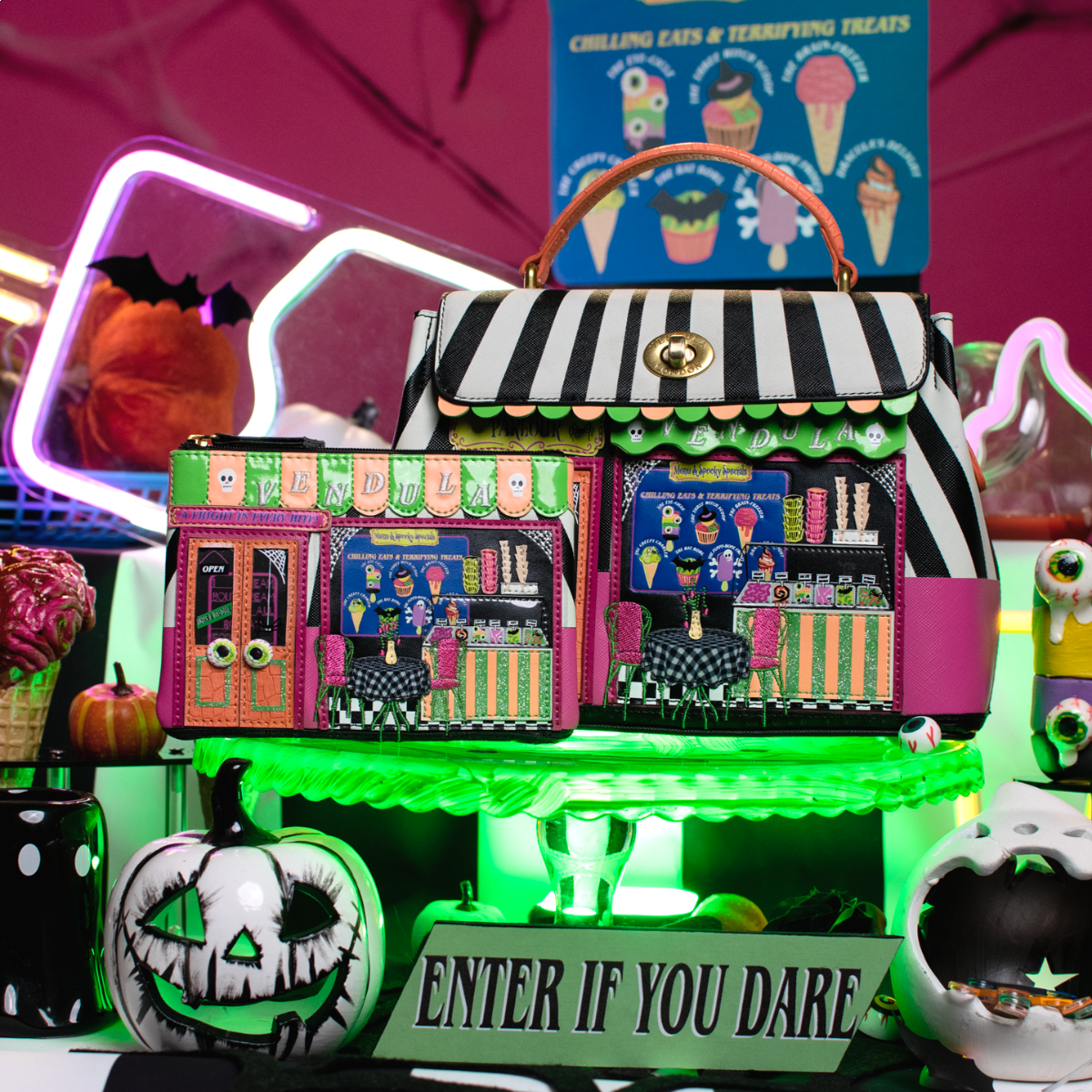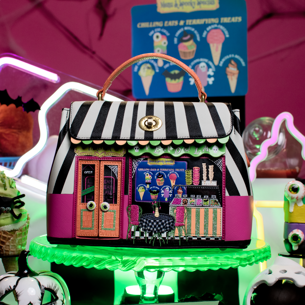 The I-Scream Parlour Mini Grace Bag will be a hit amongst our ‘’Venghoulettes’’, this autumn! This new Vendula bag is a smaller version of the classic Grace Bag, but it is just as roomy with lots of room for your essentials, and pockets galore. It comes with a comfortable handle and a detachable strap, so you can carry the bag like a handbag, over the shoulder or crossbody. Made of vegan leather, this mini grace bag is livelier than the theme may suggest: the vibrant colours, glow in the dark stripes and freaky 3D details give this bag a unique look that you will enjoy showcasing at any occasion. Go on, open the parlour’s doors and have an ice cream: there’s ‘’A fright in every bite’’!