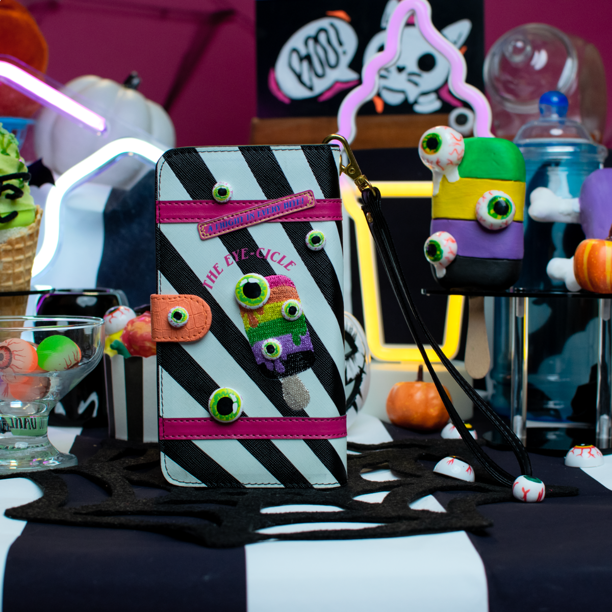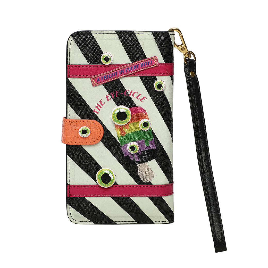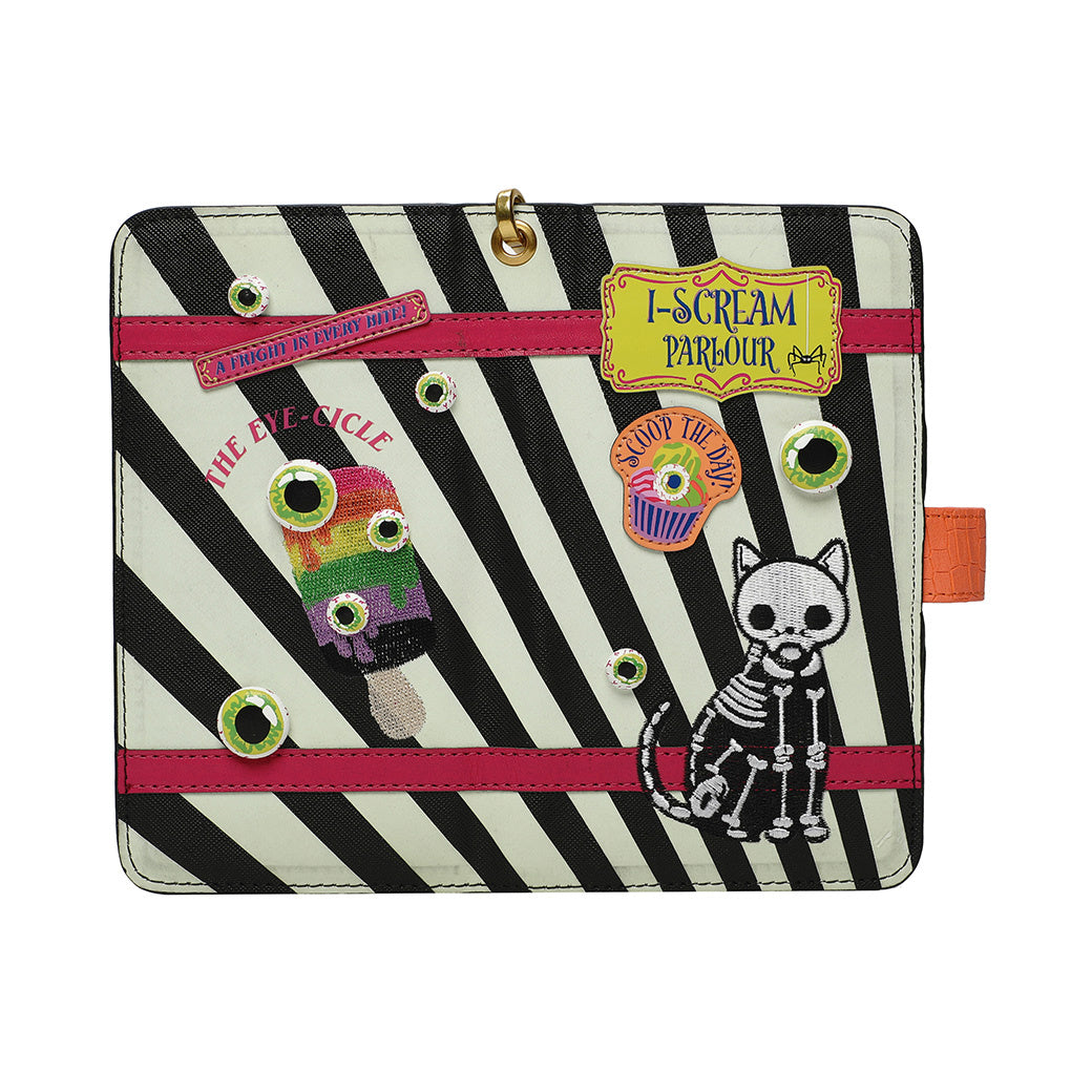 The I-Scream Parlour Universal Flip Phone Case is not for Halloween only, it can be used all year round too, matched with your I-Scream Parlour bag! This phone case comes with a wrist strap and a flap closing, however we would still suggest to use a screen protector to avoid any damage in case of a fall. The artwork on this vegan leather accessory is unrivalled: it glows in the dark and is adorned with 3D ice cream and eyeball details that will make you smile every time your check your phone. We wonder what the ‘’Bats Breath’’ ice cream tastes like… we’ll pass and let you find out instead!