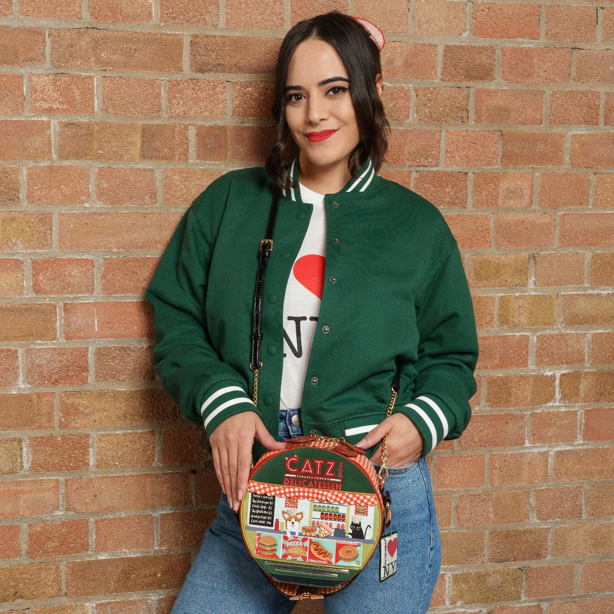 Here's one for all the foodies out there: there's a new deli in town! The New York City Cats & Corgis Hetty Bag is perfect for everyday use or to keep for a special outing. It can fit in all you need in its two compartments and the pockets will keep your essentials organised. It comes with a chic handle with a buckle, as well as a strap, so you can carry your new boutique bag the way you prefer. This vegan leather bag looks sensational in green, with gingham prints and featuring our little kitty cat and corgi, busy serving the most delicious vegan food to their customers. Would you like to try their Brooklyn Bagel or a Corn Dog? Order anything you like, it’s on us!