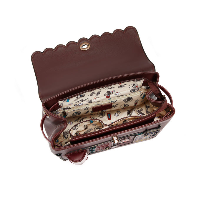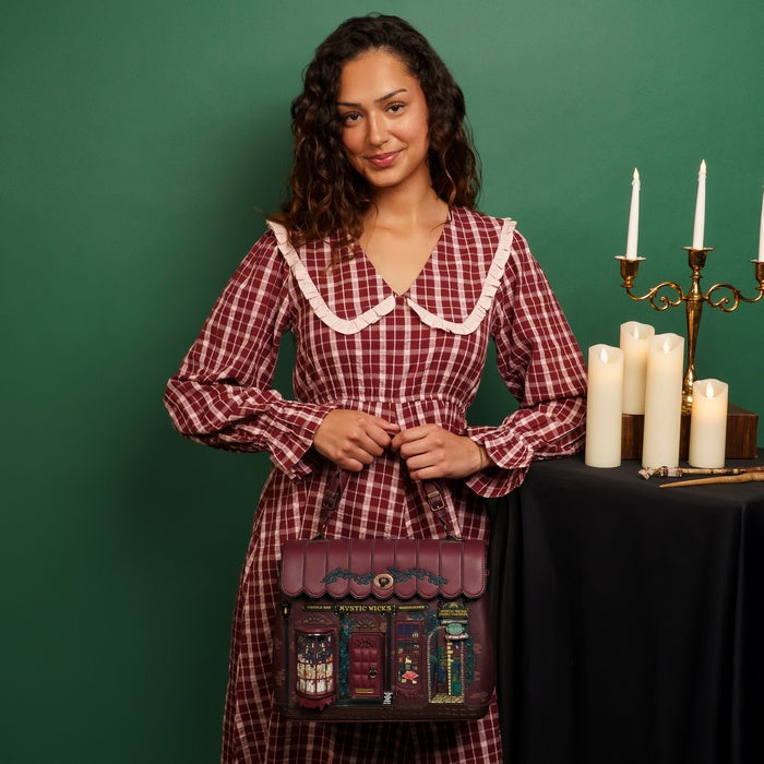 Step inside and feel the magic come alive with the newest addition to Vendula Town! The Mystic Wicks Candle and Wandmakers Grace Bag stuns in a rich burgundy hue with exclusive copper hardware, setting a stylish tone for the autumn/winter season. This vegan leather beauty features a spacious compartment and several pockets for all your essentials, plus a handle and a detachable strap so you can carry it your way. Inspired by artisan candle makers, its shopfront design is adorned with enchanting printed and appliqué elements that will make every outing feel a little more magical. Candle shopping, anyone?
